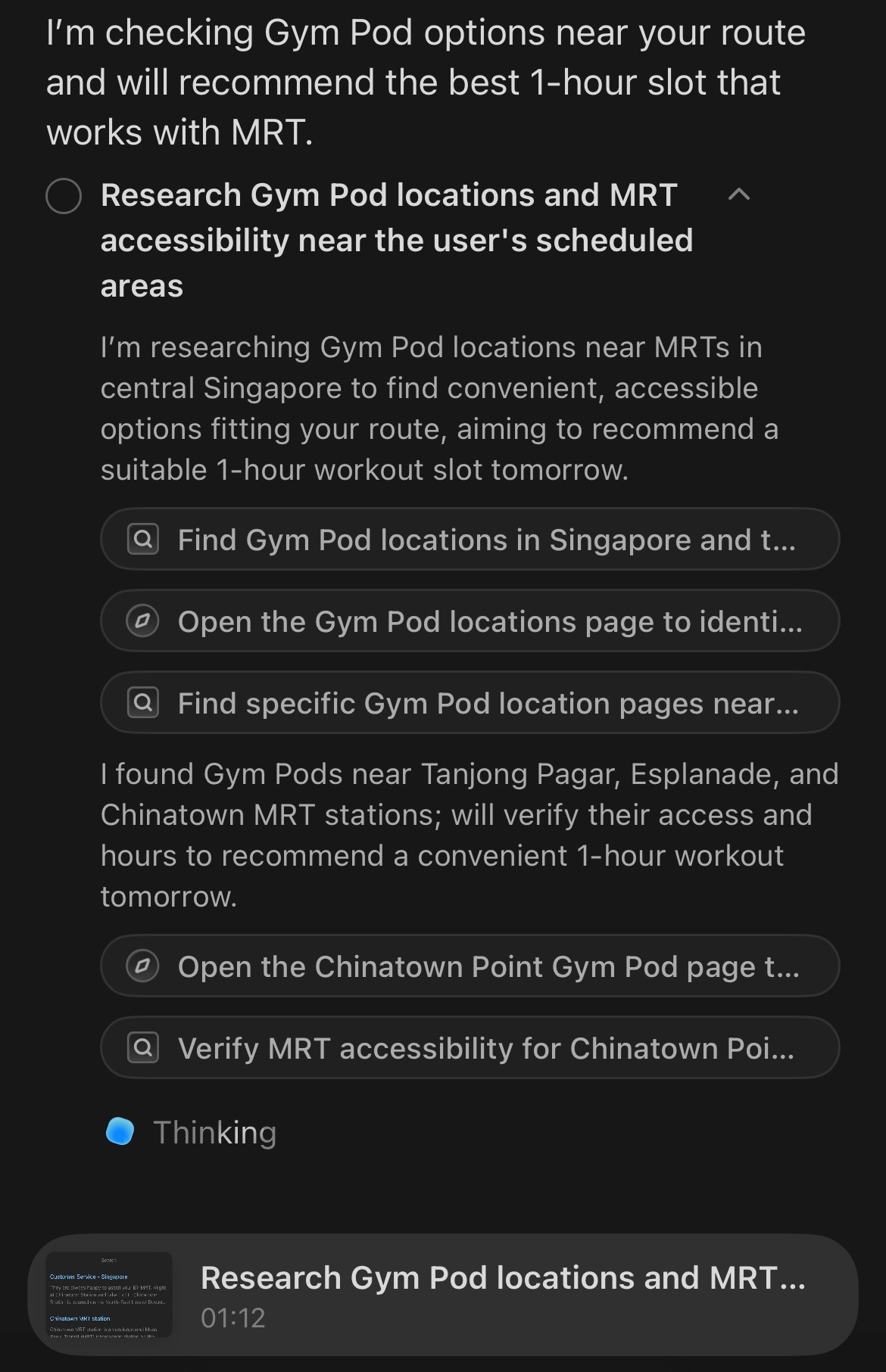 When I asked my agent to find a gym slot, I wasn’t asking it to think for me. I was asking it to act for me, to chain together a sequence of subtasks that would have taken me fifteen to twenty minutes of app-switching, map-checking, and calendar-squinting. The agent understood the fixed variables (my schedule, event locations), applied the constraints I care about (MRT access, no Grab), and worked through the problem step by step.