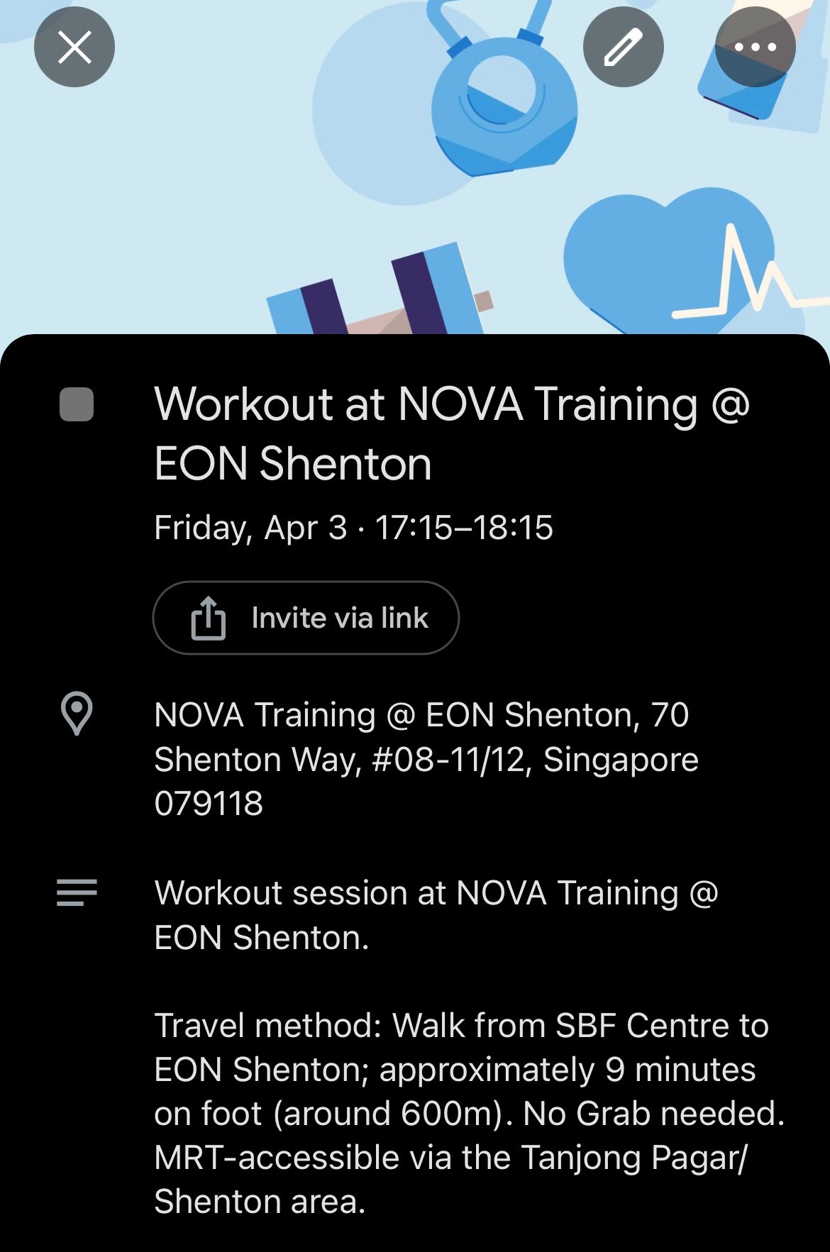 To fulfill what I asked, my agent had to do something a calendar app never could. It had to pull my calendar events for the next day, identify the fixed commitments and their locations, calculate the open windows between them, look up Gym Pod locations across Singapore, filter for ones accessible by MRT from where I’d already be during those open windows, cross-reference travel times, and find a slot where a one-hour workout, plus transit, actually fit without blowing up the rest of my day.