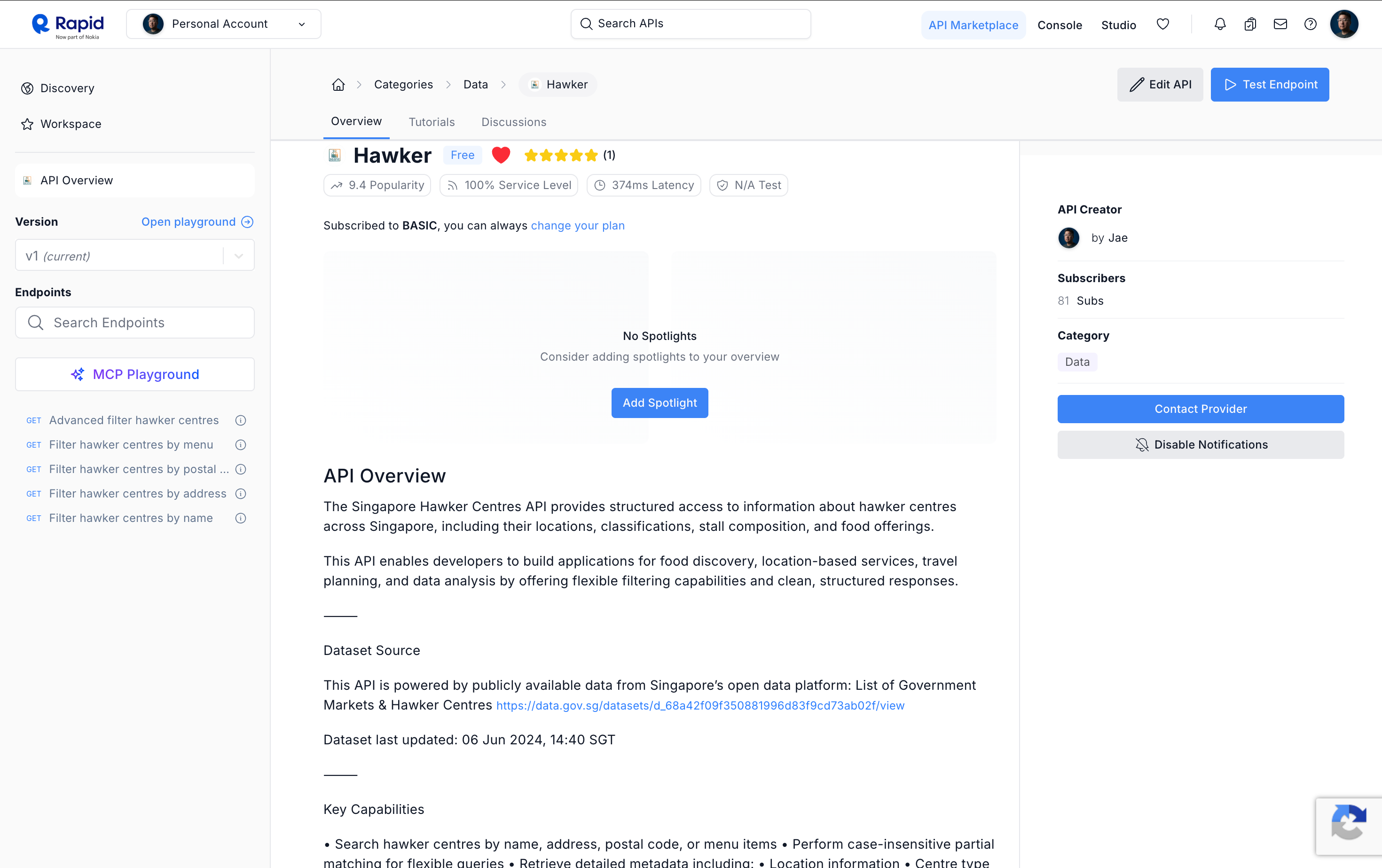 So I built a fully managed API. Clean, structured, searchable access to Singapore’s hawker centre dataset, published on RapidAPI. It wasn’t a product in the traditional sense. It wasn’t meant to be a business. It was a distribution layer. A bridge between data that existed and the experiences that could exist, if someone just made it accessible.