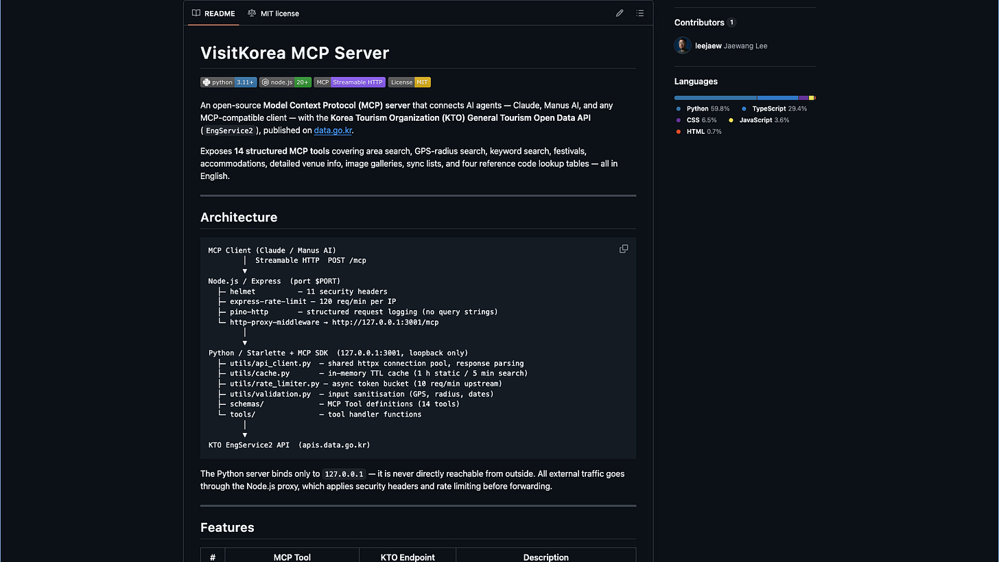 Korea Tourism Organization has a rich API. But making it genuinely useful for AI agents, for the kind of orchestrated, multi-step, context-aware workflows that can actually power meaningful personalized experiences, requires bridging a gap. The MCP (Model Context Protocol) server I built wraps Korea’s tourism data in a format that AI agents can natively understand, query, and act on. It’s published on GitHub under MIT license. Free for personal use, free for commercial use. Anyone building on it, take it.
