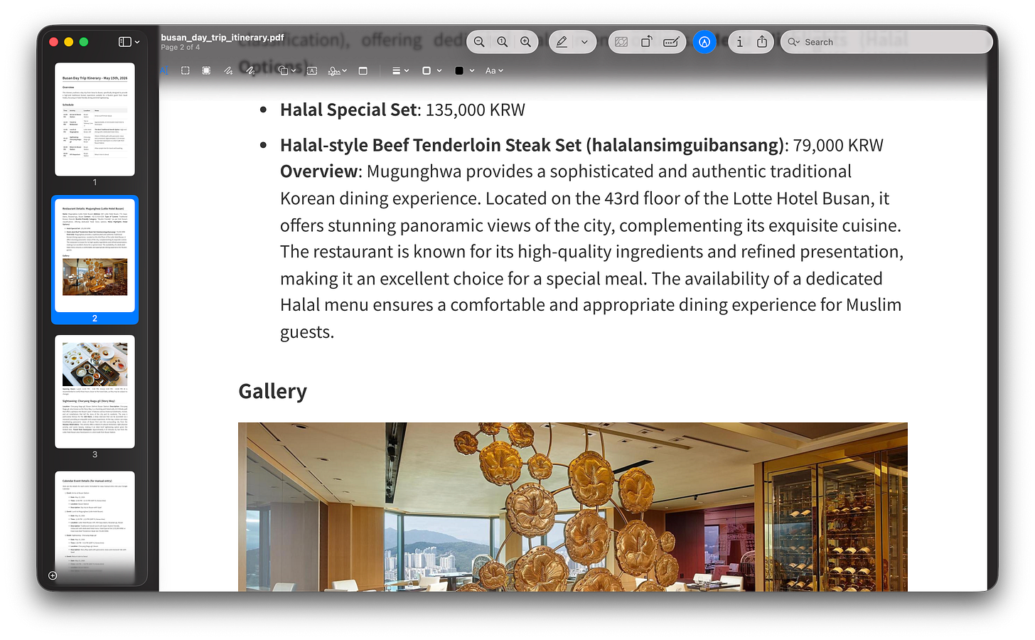 Ten minutes later, I had it all. A clean itinerary that fit my train schedule. A 43rd-floor restaurant overlooking the city with a dedicated halal menu. A scenic hillside walk behind Busan Station with a monorail ride and panoramic views of the port. A document I could hand to my guest and feel proud of.